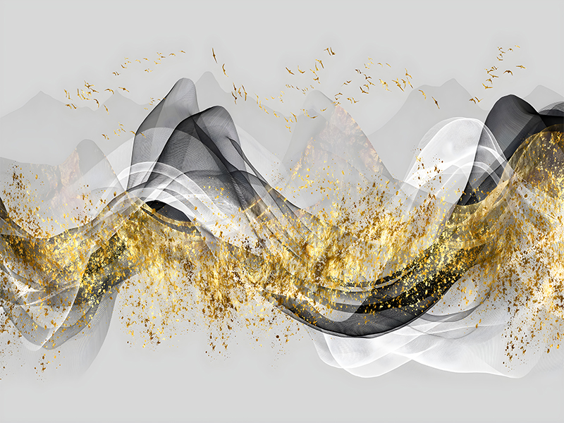 Ova tapeta donosi izuzetno luksuzan i dinamičan vizuelni efekat, kombinujući zlatne prskane detalje sa crnim i belim transparentnim talasima koji se prepliću preko stilizovanog sivog planinskog pejzaža u pozadini. Zlatni listići i siluete ptica u letu dodatno pojačavaju osećaj pokreta i elegancije, stvarajući utisak raskošnog pejzaža u apstraktnoj interpretaciji.