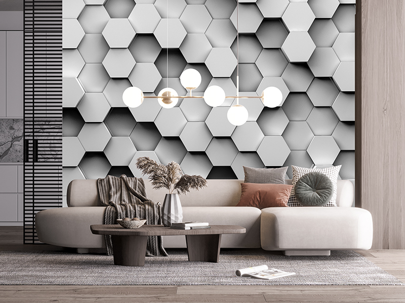 3D tapeta za odvažne sa dominatnom neobičnom belom šarom , prožetom zelenim listovima, dok se u pozadini naziru drveni heksagoni. Izuzetno specifična tapeta namenjena je za prostore sa jednobojnim nameštajem i detaljima.