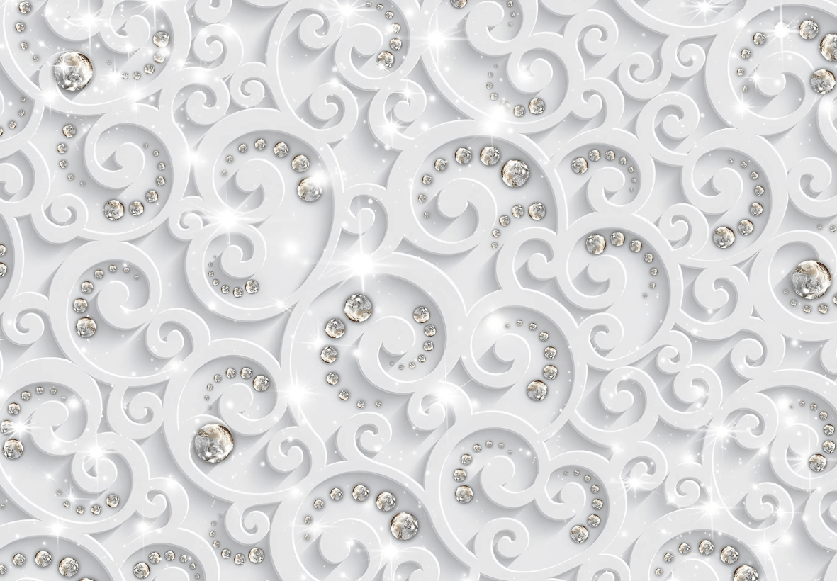 Ova fototapeta unosi u prostor osećaj luksuza i profinjene elegancije kroz bogat reljefni dezen spiralnih ornamenata ukrašenih bisernim i kristalnim akcentima. Svetla paleta i nežni sjaj stvaraju utisak dubine i pokreta, dok ornamentalni motivi podsećaju na klasične arabeske u savremenoj, sofisticiranoj interpretaciji. Zid dobija gotovo draguljsku teksturu koja reflektuje svetlost i oplemenjuje ceo enterijer.