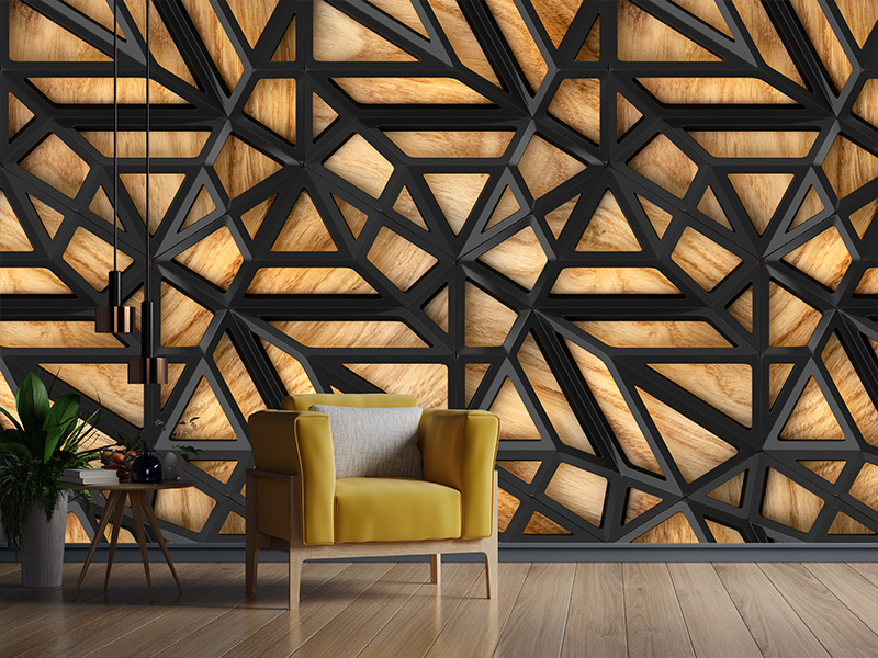 Topla igra prirodnog drveta i tamnih geometrijskih linija stvara snažan, ali sofisticiran vizuelni ritam ✨ Ova tapeta unosi osećaj stabilnosti, luksuza i modernog dizajna, savršeno balansirajući između industrijskog i elegantnog stila. Idealna je za dnevne sobe, kancelarije ili prostore u kojima želite upečatljiv, ali harmoničan ambijent 🖤🌿