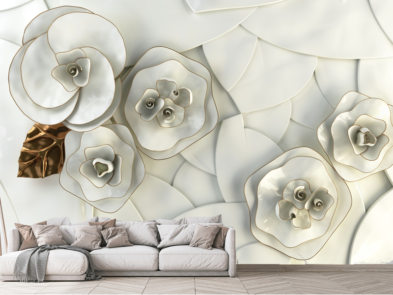 Iluzija izrezbarenih belih cvetova, poput velikih ukrasa od porcelana. Ova foto tapeta će uneti romantični momenat u enterijer.