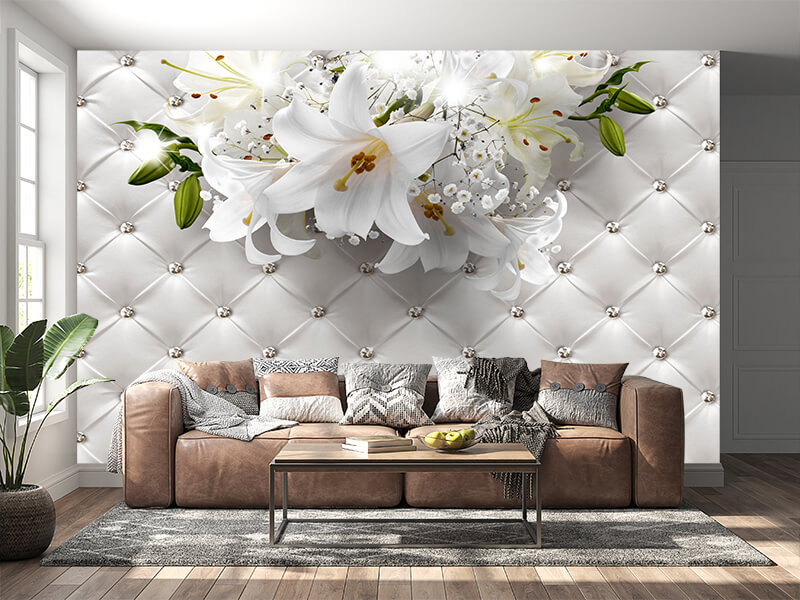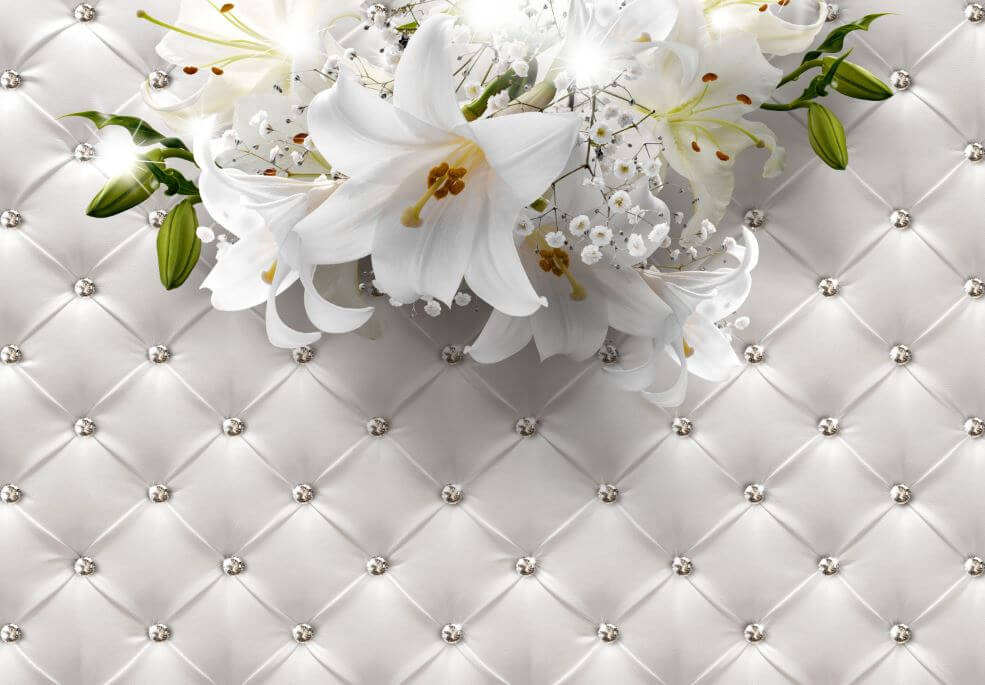 Fototapeta „Beli Cvetni Luksuz“ spaja eleganciju belih ljiljana sa luksuznim efektom tapacirane površine ukrašene kristalima. Savršena je za stvaranje raskošnog ambijenta u dnevnim sobama, spavaćim prostorima ili modernim enterijerima koji traže dašak glamura. Ova tapeta unosi svetlost, nežnost i sofisticiranost u svaki prostor.