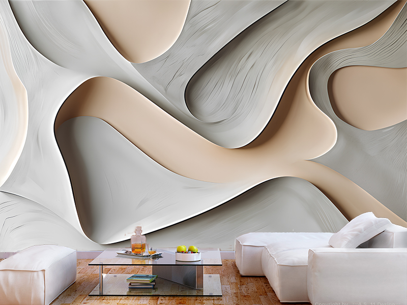 Ova tapeta prikazuje elegantan spoj mekih, zakrivljenih linija i trodimenzionalnih oblika u nijansama bež, krem i sive boje. Vizuelni efekat dubine i senke stvara iluziju realnih, izrezbarenih talasa koji se prelivaju preko zida. Tapeta unosi osećaj pokreta i modernog luksuza u enterijer, savršena je za prostore koji žele da ostave snažan estetski utisak.