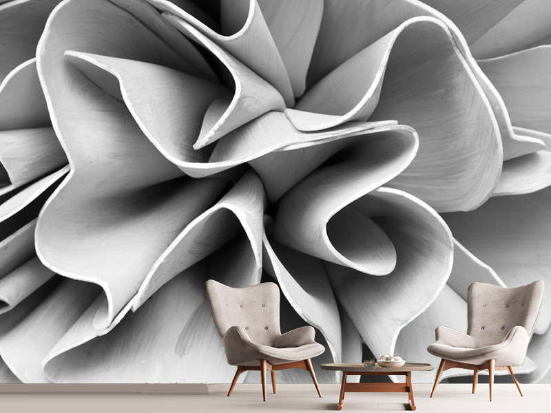 Poput naboranih cvetnih listova u crno-beloj varijanti, ova tapeta će biti pravo umetničko delo na Vašem zidu.