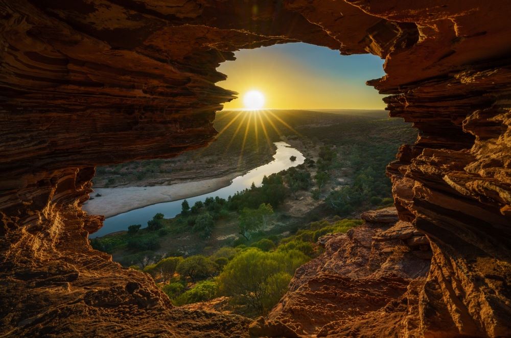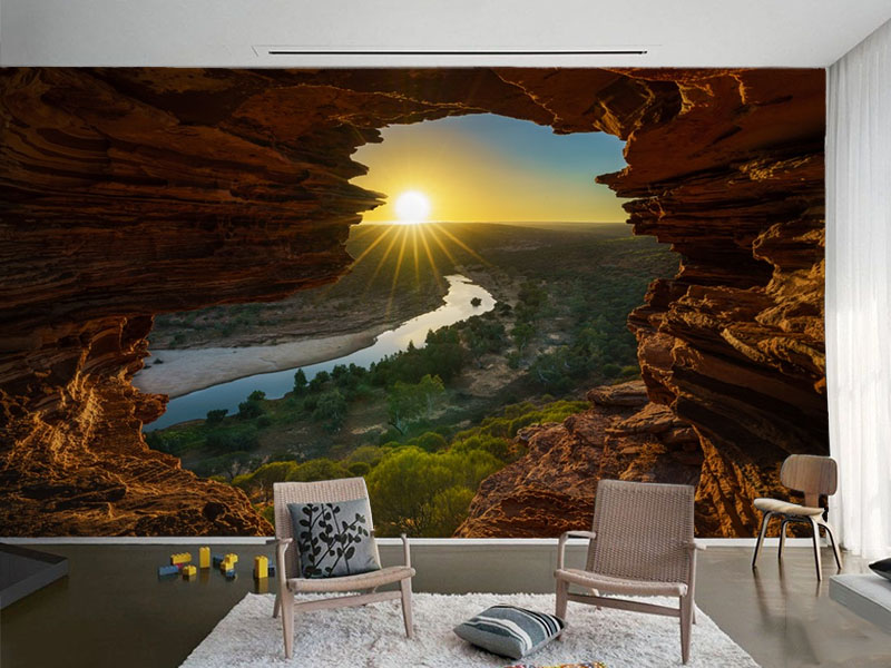 Doživite magičan trenutak prirode svakog dana uz ovu zapanjujuću 3D tapetu koja prikazuje pogled iz pećine na reku i zalazak sunca. Topli tonovi stena i zlatne zrake svetlosti unose spokoj i dubinu u vaš prostor, stvarajući osećaj otvorenosti i povezanosti s prirodom.