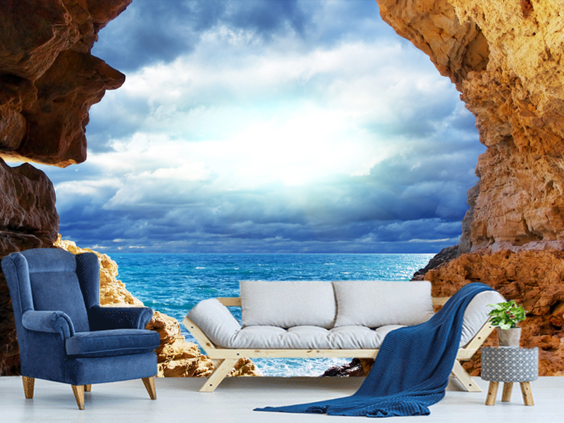 Transformišite vaš prostor u spektakularan pogled iz morske pećine uz ovu fotorealističnu 3D tapetu. Pogled na nemirno more i svetlost koja se probija kroz oblake stvara dramatičnu i opuštajuću atmosferu, kao da ste na ivici čudesne obale.