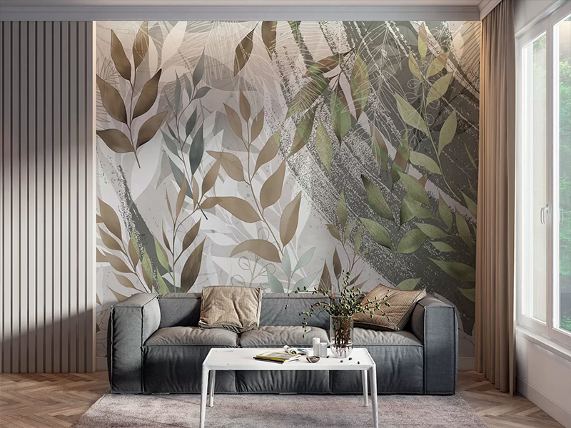 Tapeta sa motivom stilizovanog lišća u nežnim nijansama zelene, maslinaste i bež boje unosi svežinu i prirodnu harmoniju u svaki enterijer. Kombinacija botaničkog dizajna i apstraktnih tekstura daje prostoru osećaj lakoće, topline i modernog karaktera.