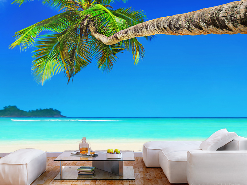Pod okriljem palme, pogled na mirno more koje se stapa sa plavetnilom neba na horizontu. Ova tapeta predstavlja odmor za dušu i reflektuje pozitivne vibracije.