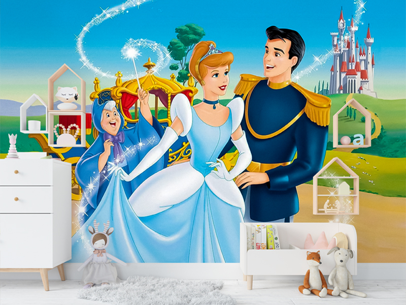 Fototapeta „Bajka o staklenoj cipelici“ prikazuje nezaboravan bajkoviti trenutak ispunjen elegancijom, toplinom i čarolijom. Centralni motiv čini nežna princeza u svetloplavoj balskoj haljini, okružena princem i dobrodušnom vilom koja magičnim štapićem donosi sjaj i svetlucave iskre u scenu.