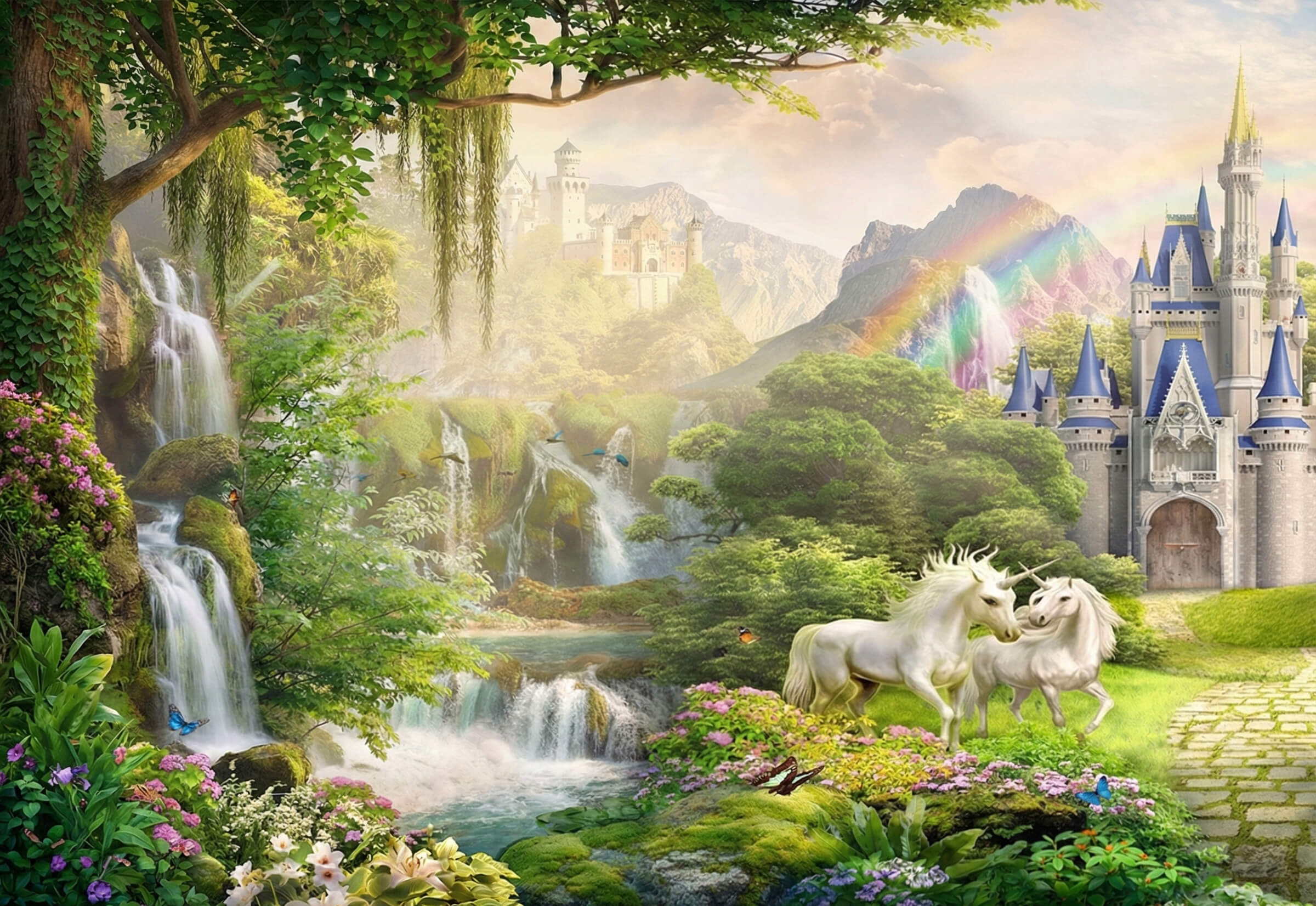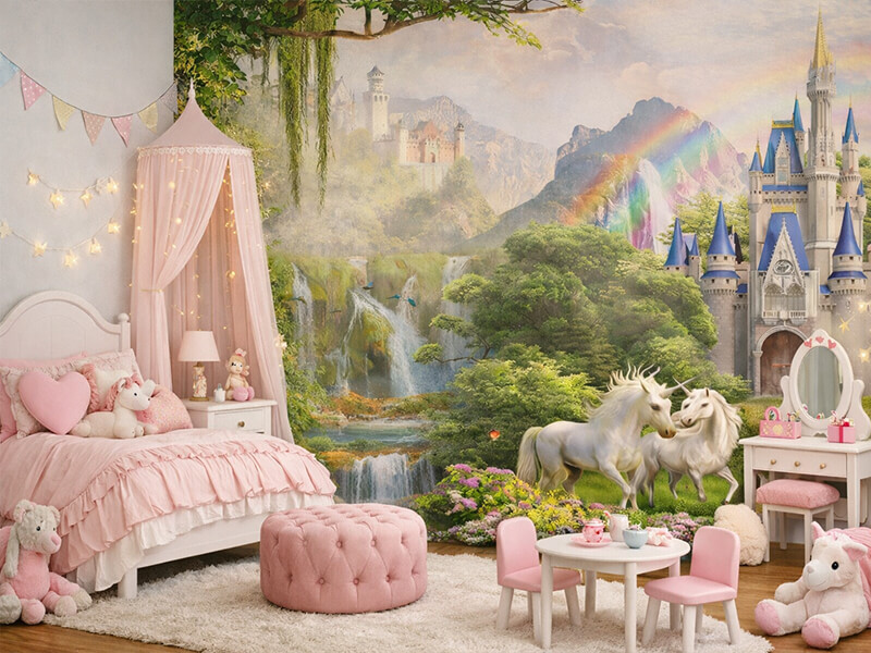 Čarobni pejzaž ispunjen dvorcima, vodopadima i nežnim bojama duge pretvara zid u bajkovitu scenografiju punu mašte. Elegantni jednorogi u zelenoj dolini unose osećaj čuda i nežne fantazije, dok bogati detalji prirode stvaraju dubinu i toplinu prostora.