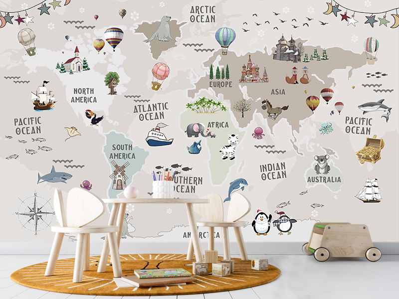 Nežna i razigrana fototapeta sa mapom sveta koja decu vodi na čarobno putovanje iznad kontinenata. Baloni, avioni i bajkoviti detalji stvaraju osećaj slobode, mašte i beskrajne radoznalosti.