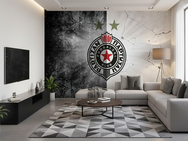 Fototapeta „Crno-Bela Dominacija“ donosi upečatljiv prikaz grba FK Partizan postavljenog na dramatičnu, teksturisanu pozadinu koja podseća na beton i ispucali zid. Kontrast tamne i svetle polovine zida simbolično oslikava snagu, balans i karakter kluba, dok centralno pozicionirani grb dominira prostorom.