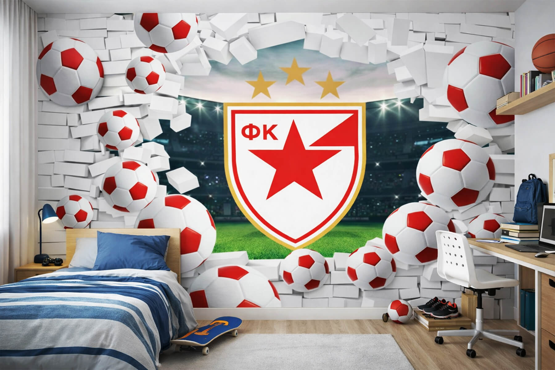Moćna 3D fototapeta sa grbom Crvene zvezde donosi atmosferu punog stadiona pravo u sobu. Efekat razbijenog zida i lopte u pokretu stvaraju snažan osećaj dubine, dinamike i neprekidne borbe za pobedu, dok crveno-bela kombinacija zrači energijom, strašću i tradicijom ⭐️❤️🤍