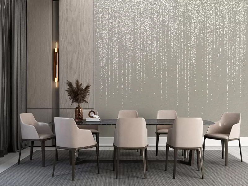 Tapeta sa elegantnim linijama koje sijaju poput kiše svetlucavih bisera donosi glamur u svakodnevni prostor. Savršena za trpezarije i luksuzne enterijere. 💫