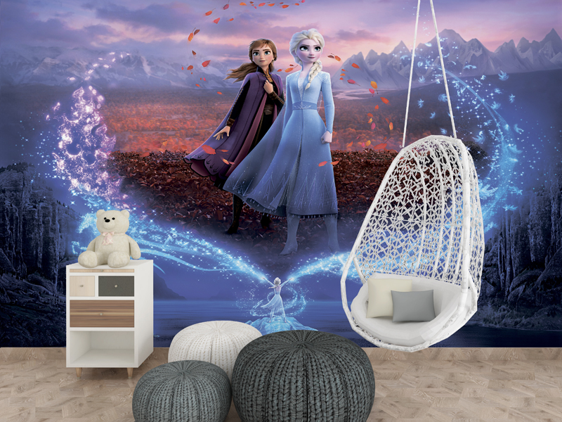 Bajkovita fototapeta inspirisana filmom Frozen, koja prikazuje snagu sestrinske veze kroz magični spoj prirode, godišnjih doba i ledene čarolije.