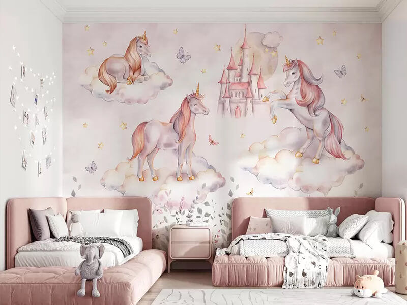 Ova fototapeta donosi suptilnu i romantičnu bajku ispričanu kroz pastelne tonove i mekane oblike. Jednorozi su raspoređeni na oblacima kao da lebde u tišini, dok se u pozadini nazire bajkoviti dvorac – simbol sigurnosti, snova i detinjstva ispunjenog maštom.