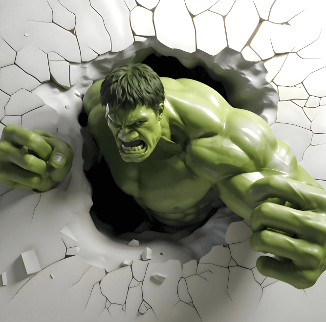 Snaga koja ruši zidove! Ako vaše dete voli snagu i akciju, ovaj motiv je nepogrešiv izbor. U fokusu je Hulkova ogromna, mišićava ruka koja probija beli zid od cigle, ostavljajući iza sebe krhotine i prašinu. Ovaj dizajn je toliko realističan da ćete imati utisak da će pesnica svakog trenutka izaći u prostoriju.