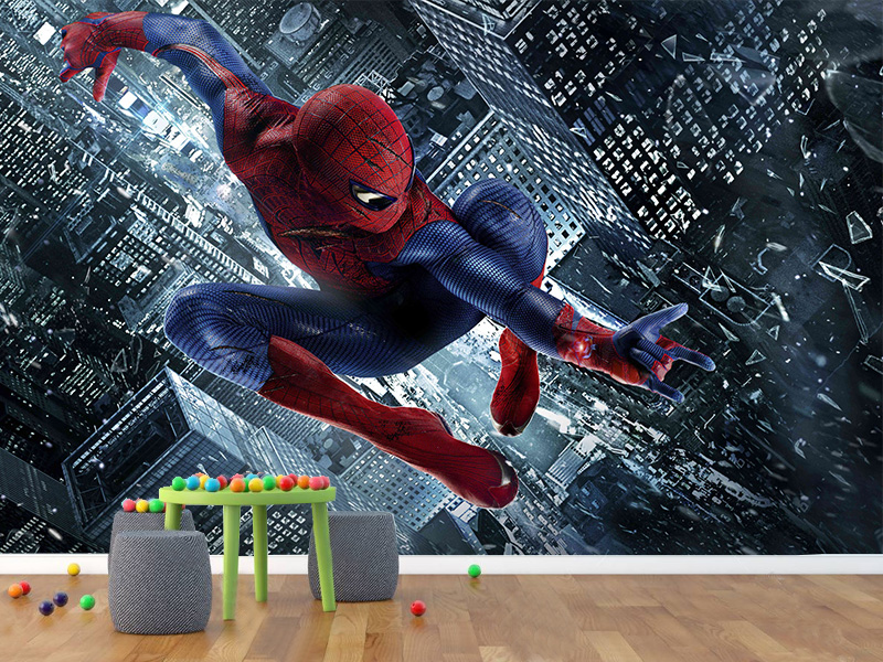 Dinamična i moćna fototapeta koja prikazuje heroja u smelom skoku između visokih gradskih zgrada. Idealan izbor za decu koja vole akciju, brzinu i urbane herojske avanture.