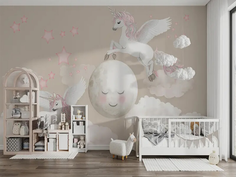 Bajkovita pastelna fototapeta koja dečiju sobu pretvara u nežan svet snova, mašte i spokojne noći. Idealna za decu koja vole magične motive, jednoroge i romantičnu, umirujuću atmosferu.