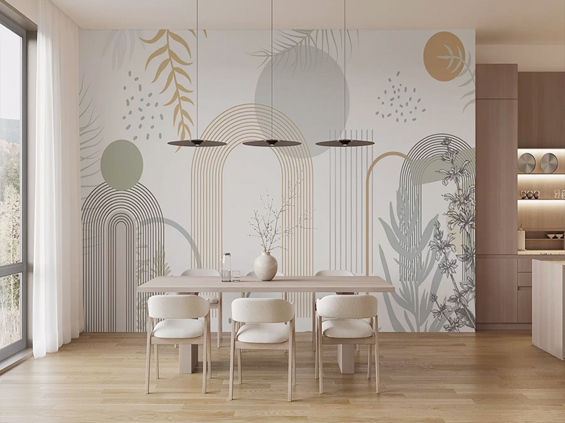 Ova moderna tapeta u skandinavskom stilu kombinuje apstraktne geometrijske oblike sa nežnim biljnim motivima, stvarajući savršenu ravnotežu između minimalizma i prirode. U tonovima bež, zelene i zlatne, idealna je za trpezarije i otvorene prostore kojima želite dodati sofisticiranost i umirujuću atmosferu.