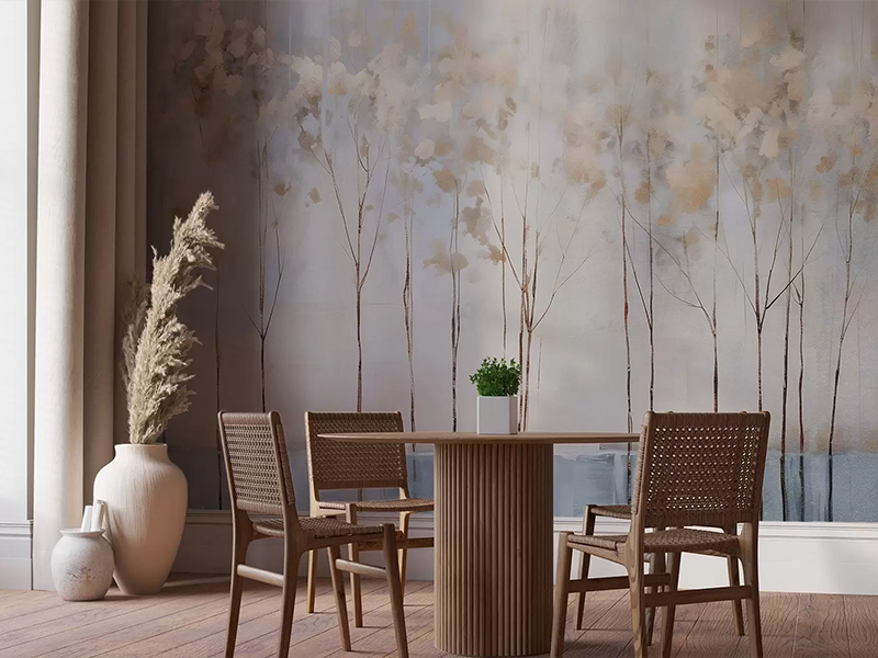 Tapeta „Jutarnja Tišina“ unosi spokojnu atmosferu prirode u vaš dom, sa nežno oslikanim stablima u blagim tonovima sive, bež i plave. Ovaj motiv stvara osećaj mira i dubine, savršen za trpezarije, čitaonice i prostore za opuštanje. Njena pastelna paleta idealno se uklapa u skandinavske i minimalističke enterijere.