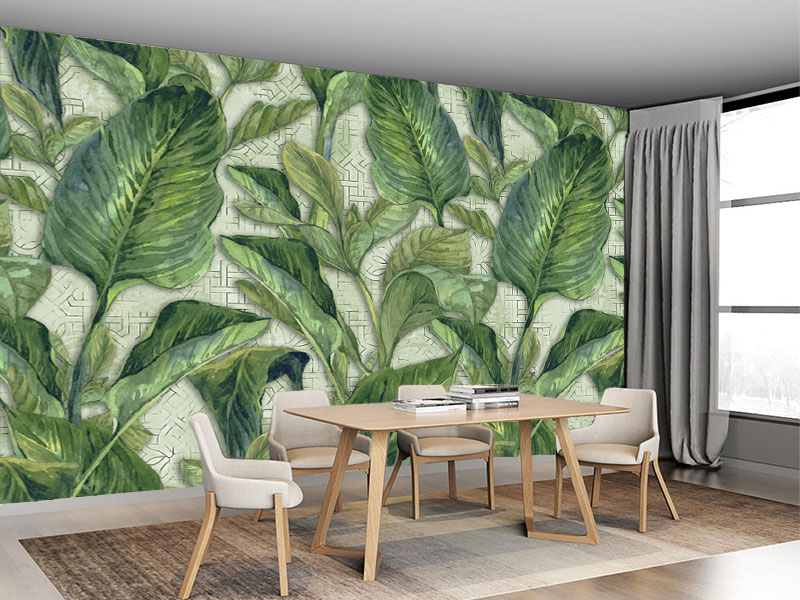 Oslikani veliki zeleni listovi, čine jednostavan ali efektan prikaz na ovoj tapeti. Umirujuća zelena boja nikad ne izlazi iz mode kad je reč o oplemenjivanju prostora.