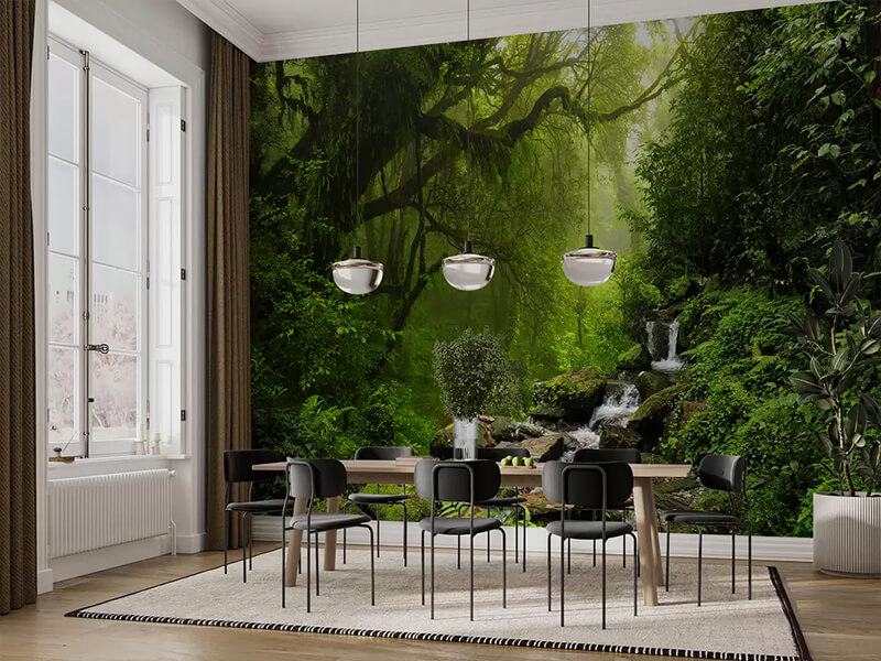 Unesite dah egzotike u svoj dom uz fototapetu koja prikazuje čarobnu prašumu okupanu jutarnjom maglom. Bujno zelenilo, kristalno čisti potočić i svetlost koja se probija kroz krošnje stvaraju osećaj mira i povezanosti sa prirodom. Idealna za dnevne sobe, trpezarije ili radne prostore, ova fototapeta pretvara svaku prostoriju u oazu svežine i harmonije.