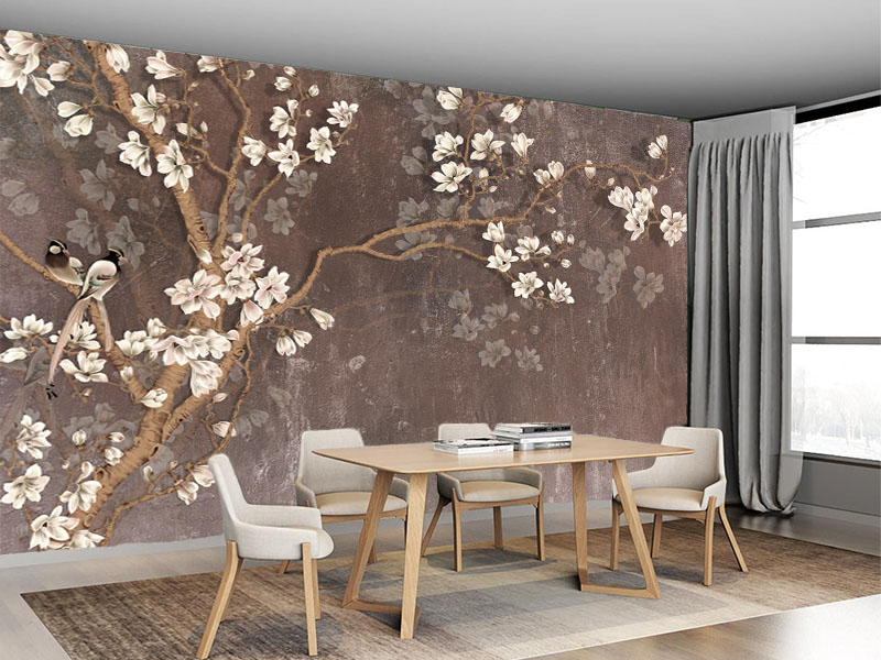 Foto-tapeta sa motivom magnolije predstavlja spoj klasične umetnosti i savremenog dizajna. Razgranato drvo sa nežno modeliranim cvetovima i diskretnim siluetama latica na pozadini u toplim, zemljanim tonovima stvara utisak zidne freske – elegantne, bezvremenske i izuzetno upečatljive. Suptilna tekstura u pozadini dodatno naglašava dubinu i daje tapeti karakter patine, kao da je deo starog umetničkog salona ili sofisticiranog enterijera sa dušom. Motiv ptica na granama unosi život, lakoću i osećaj prirodne harmonije. Ova tapeta je idealna za luksuzne dnevne boravke, trpezarije, hotele, salone i prostore koji traže umetnički izraz sa dozom prirodne elegancije.
