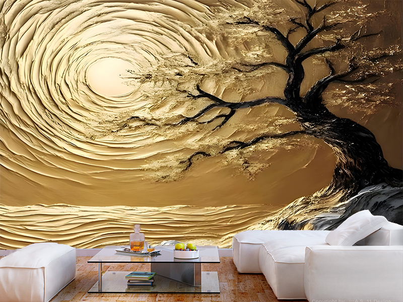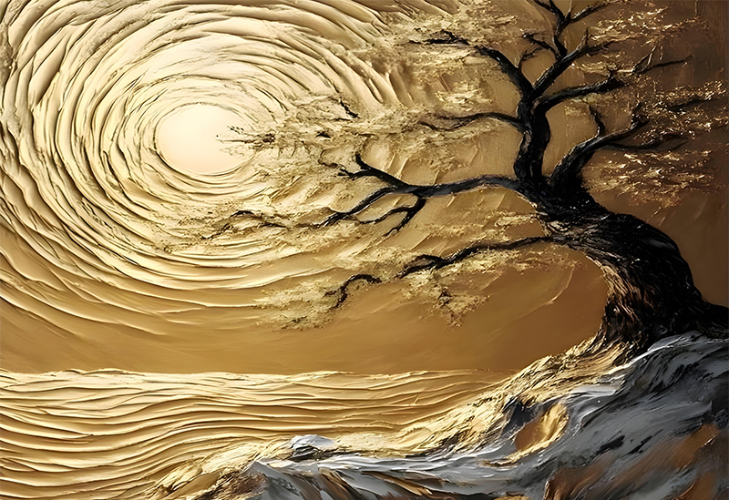 Ova impresivna 3D fototapeta prikazuje dramatično oblikovano drvo koje se pruža ka zlatnom vrtlogu svetlosti, stvarajući efekat kretanja i energije. Kombinacija zlatnih nijansi, dubokih senki i reljefne teksture čini ovu tapetu snažnim umetničkim izjavom u svakom enterijeru. Idealna je za moderne prostore koji teže luksuzu i simbolici prirode.
