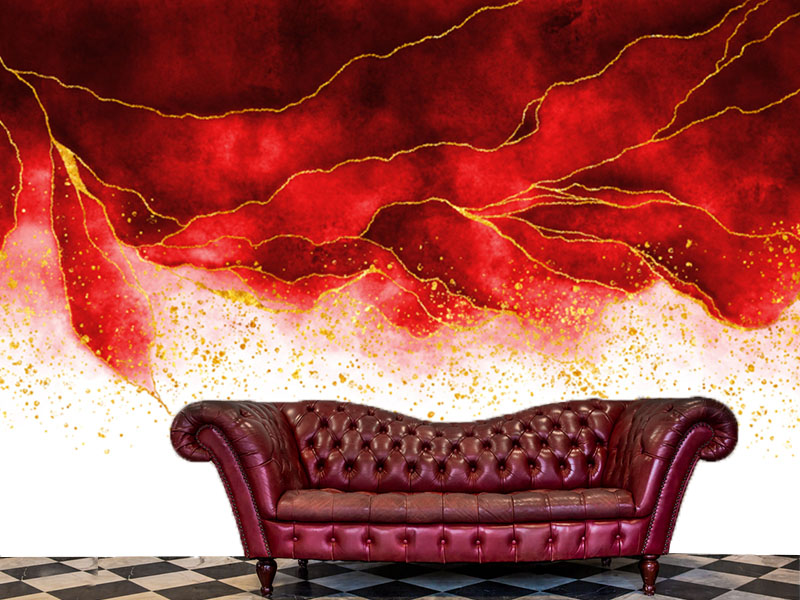 Tapeta sa belom podlogom poput mermera na kojoj su u savršenom skladu obrisi crvene oivičene zlatnom, koje čine ovu tapetu prefinjenom.
