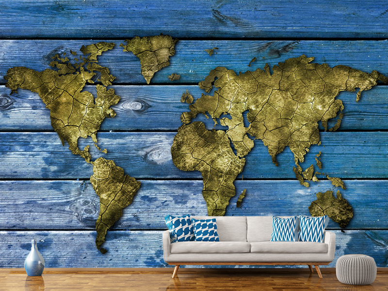 Prikaz na plavoj drvenoj pozadini i kontinenti koji kao da su formirani od zelenog lišća. Ova specifična kompozicija karte sveta uneće harmoniju u Vaš kutak.