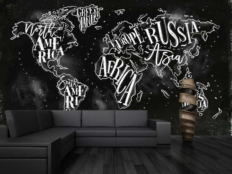 Oivičeni umetnički prikaz kontinenata ispunjenih njihovim nazivima. Neobična foto tapeta karte sveta crne boje sa belim obrisima i slovima, oplemeniće prostor svojom elegancijom.