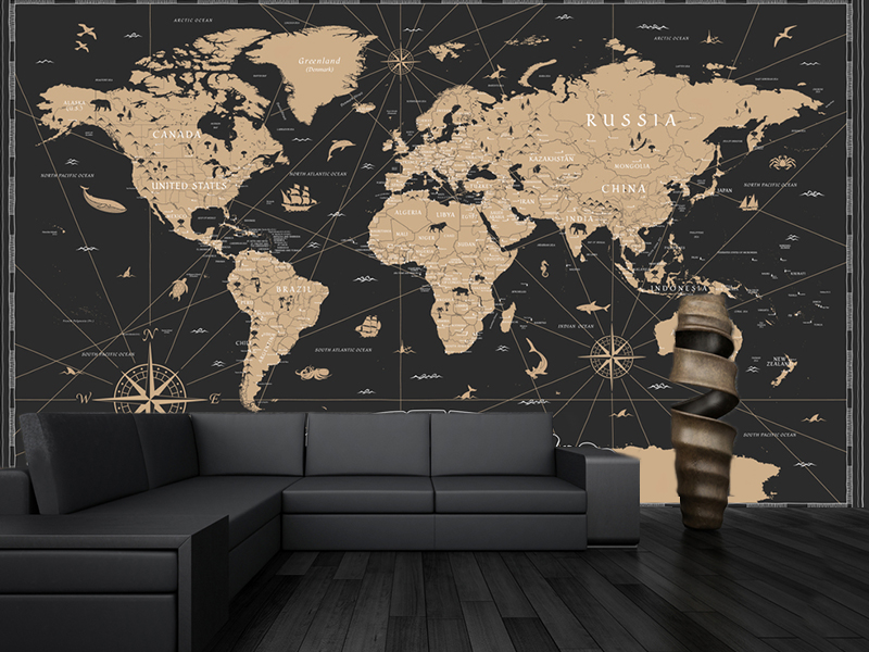 Prefinjeni prikaz mape sveta na tamnoj pozadini. Detalji na ovoj foto tapeti čine je magičnom kompozicijom koja će fantastično upotpuniti enterijer.