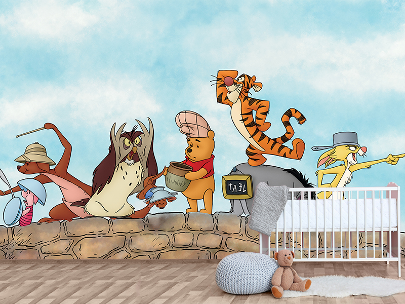 Razigrana fototapeta sa Medom Puhom i prijateljima u veseloj avanturi, savršena za dečiju sobu punu mašte i topline.