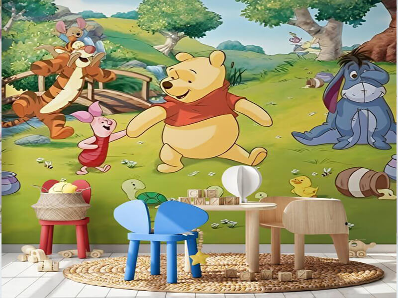 Vesela i topla fototapeta sa Medom Puhom i prijateljima u razigranoj šumskoj sceni, savršena za dečiju sobu ispunjenu osmehom i maštom.