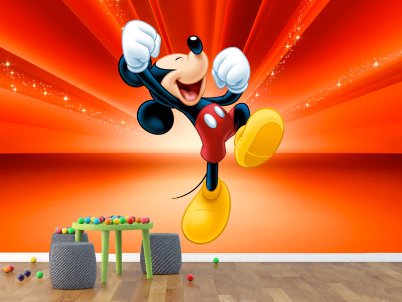 Centralna figura je jasno izražena i vizuelno dominantna, ali kompozicija ostaje čista i pregledna, što čini tapetu idealnom i za manje dečije sobe. Svetlosni efekti stvaraju osećaj dubine i pokreta, dok Miki svojim osmehom i gestovima unosi pozitivnu emociju i podstiče dobro raspoloženje.