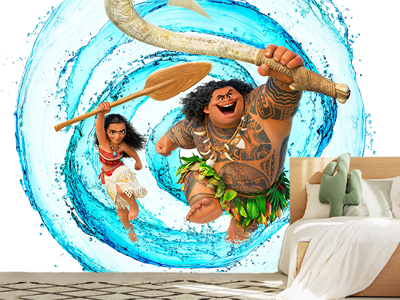 Fototapeta „Moana i Maui u Talasu avanture“ donosi snažnu, tropsku energiju kroz spektakularni vrtlog plavog talasa koji uokviruje omiljene junake. Kompozicija je dinamična i puna pokreta – Maui sa veslom i Moana u odlučnom koraku simbolizuju hrabrost, prijateljstvo i istraživački duh. Intenzivne nijanse tirkizne i plave osvežavaju prostor i vizuelno ga proširuju, dok beli zid u pozadini daje ravnotežu i sprečava prenatrpanost.