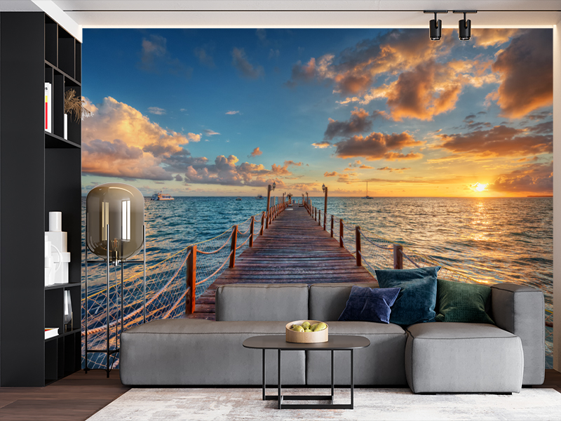 Fototapeta sa dugim drvenim molom koji vodi pravo ka zlatnom zalasku sunca nad morem donosi prostoru osećaj slobode, dubine i romantične atmosfere. Plavetnilo mora, dramatični oblaci i topla svetlost horizonta stvaraju prizor koji podseća na mirne trenutke uz obalu.