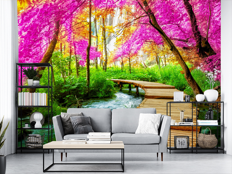 Romantična i živopisna fototapeta koja prostor pretvara u bajkovitu šumu ispunjenu cvetnim krošnjama, mirnim potokom i drvenim mostom koji vodi kroz prolećni pejzaž.