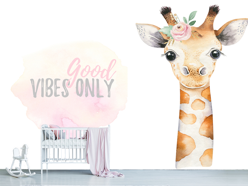 Akvarel nežnost sa stilom Dizajn karakteriše prelepa akvarel tehnika koja portretu žirafe daje mekoću i umetničku vrednost. Žirafa je ukrašena nežnim cvetnim venčićem na glavi, što doprinosi ženstvenom i pitomom izgledu. Na levoj strani se nalazi meka, pastelna „fleka“ u roze i breskvastim tonovima koja služi kao podloga za natpis „Good Vibes Only“. Bela pozadina dominira dizajnom, osiguravajući da soba ostane svetla, čista i moderna, dok krupni motivi daju zidu fokusnu tačku bez pretrpavanja prostora.