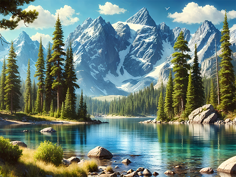 Fototapeta „Ogledalo Alpa“ prikazuje veličanstvene planinske vrhove koji se uzdižu iznad mirnog, tirkiznog jezera. Visoki borovi uokviruju prizor, dok voda poput ogledala reflektuje snežne padine i plavo nebo sa blagim oblacima. Kompozicija odiše ravnotežom – snaga planine i smirenost vode stapaju se u savršenu harmoniju.