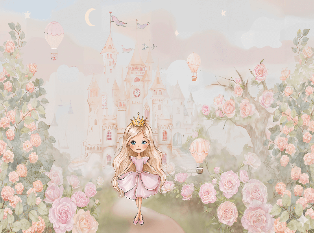 Ova fototapeta izgleda kao ilustracija iz najlepše bajke pred spavanje. U središtu kompozicije nalazi se mala princeza koja lagano korača ka dvorcu u pozadini, okružena ružama, mekim granama i pastelno oslikanim nebom. Ceo prizor deluje lagano, gotovo kao san – bez jakih kontrasta i agresivnih boja.