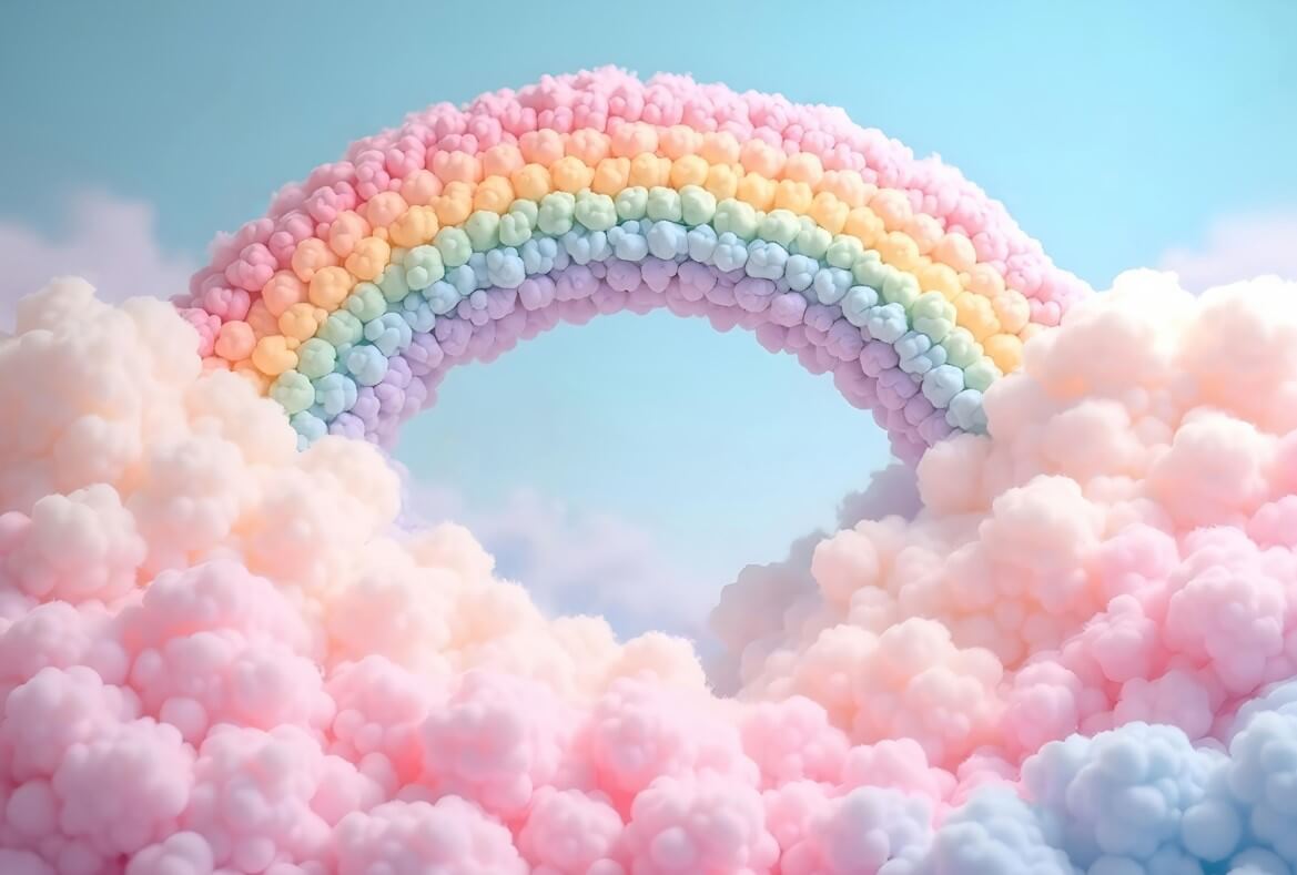• 3D Pufnasta Duga: Centralni motiv je duga sačinjena od pastelnih „pufni“ u roze, žutim, zelenim i plavim tonovima, što zidu daje neverovatnu dubinu i teksturu.