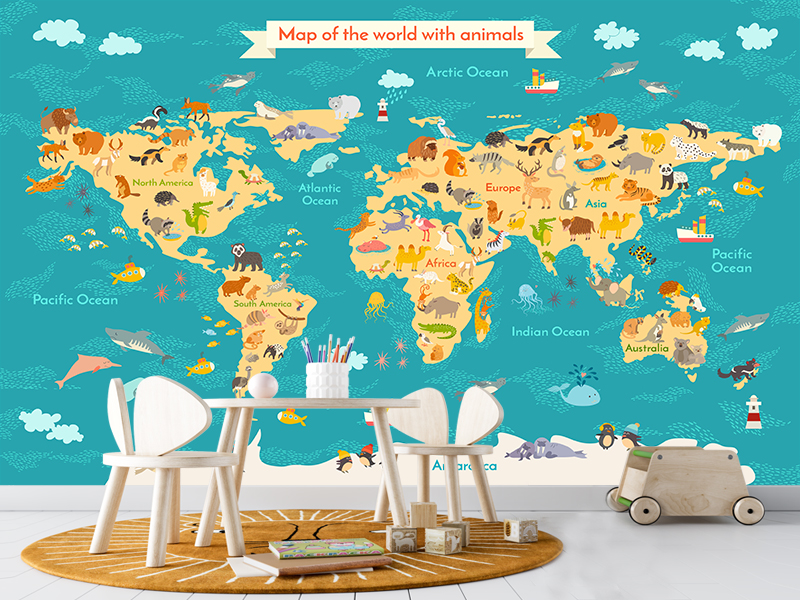 Fototapeta „Putovanje kroz životinjski svet“ pretvara zid dečije sobe u šarenu mapu planete, ispunjenu preslatkim ilustracijama životinja iz celog sveta. Kontinenti su jasno oblikovani i obojeni u vedre, prijateljske tonove, dok su okeani prikazani u smirujućim nijansama plave, stvarajući prijatan i uravnotežen vizuelni doživljaj.