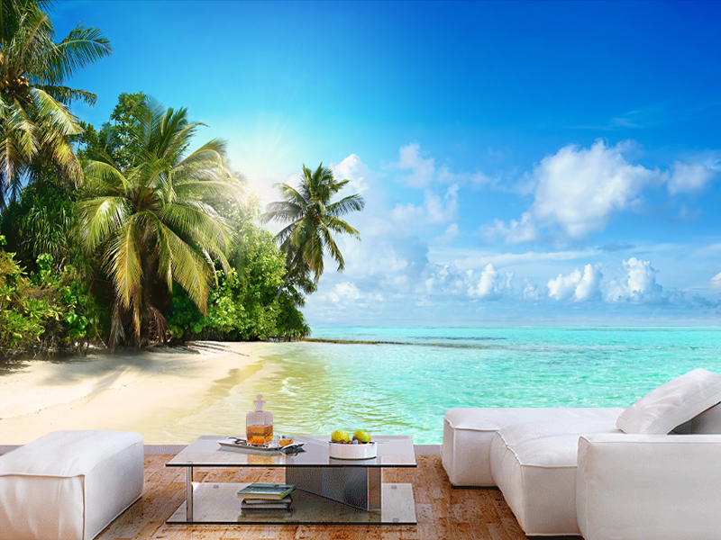Kompozicija je prostrana i vazdušasta, sa otvorenim horizontom koji daje dubinu i osećaj širine. Ova fototapeta pretvara zid u pogled ka sopstvenoj tropskoj oazi, idealnoj za opuštanje i beg od svakodnevnice.