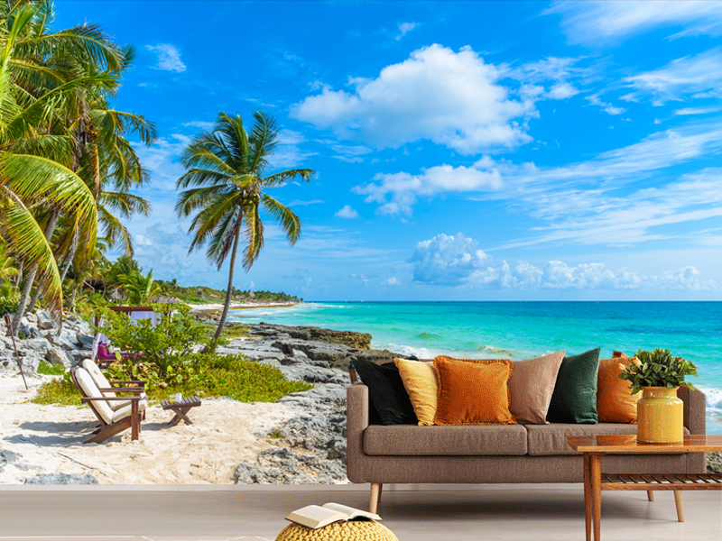 Egzotična tropska obala sa palmama, svetlim peskom i tirkiznim morem stvara prizor savršenog odmora i prirodnog spokoja. Ova fototapeta unosi u enterijer atmosferu topline, svetlosti i bezbrižnog tropskog raja.