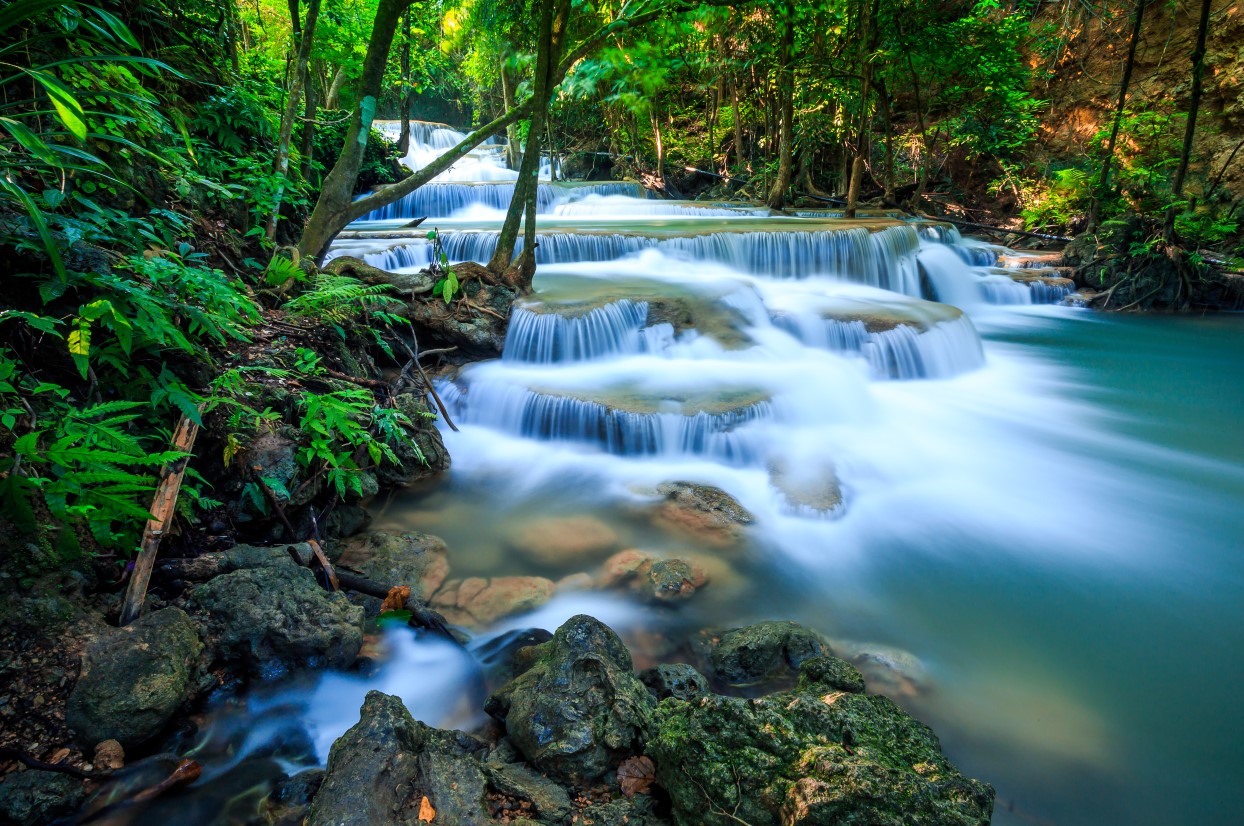 Fototapeta „Reka Večnog Mira“ prikazuje kaskadne slapove kristalno čiste vode koji se nežno prelijevaju preko stena, okruženi bogatim zelenilom tropske šume. Dug ekspozicioni efekat vode stvara svilenkast izgled, dajući prizoru dodatnu dubinu i osećaj neprekidnog toka. Kompozicija je dinamična, ali uravnotežena – voda u pokretu donosi energiju, dok gusti zeleni tonovi šume unose stabilnost i mir.
