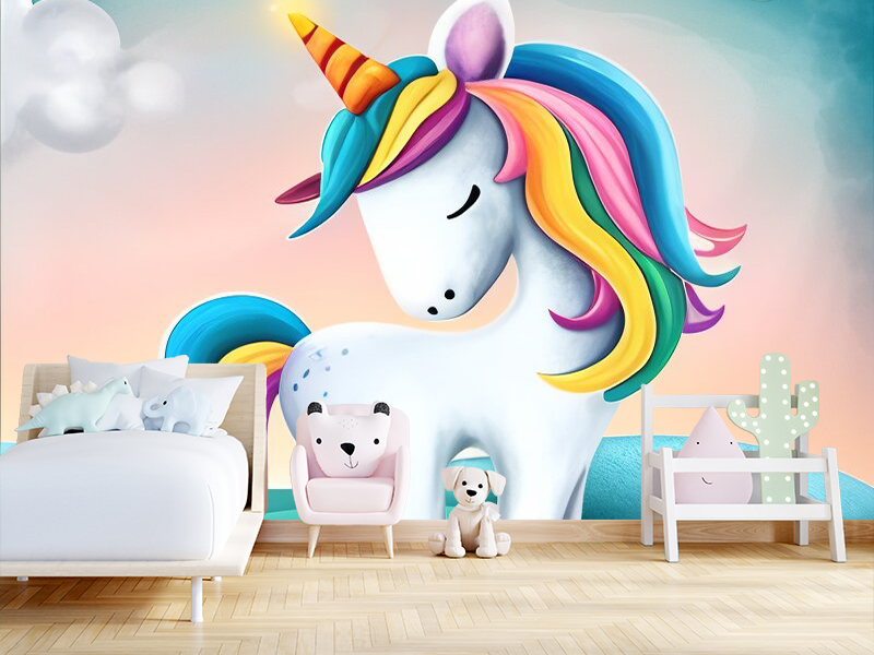 Nežna i umirujuća fototapeta sa jednorogom koja unosi mir, toplinu i bajkovitu atmosferu u dečiju sobu. Savršena za prostor namenjen odmoru, snovima i spokojnim trenucima detinjstva.