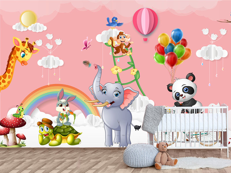Dizajn fototapete oslanja se na nežnu roze pozadinu koja prostoru daje toplinu i mekoću. U prvom planu su simpatične životinje – slonić, panda, žirafa, zeka, kornjača i majmun – prikazane u razigranim pozama, okružene balonima, oblacima i dugom. Ilustrativni stil je bogat detaljima i vedrim bojama, ali ostaje prijatan za oko, čineći sobu živahnom bez vizuelnog opterećenja.