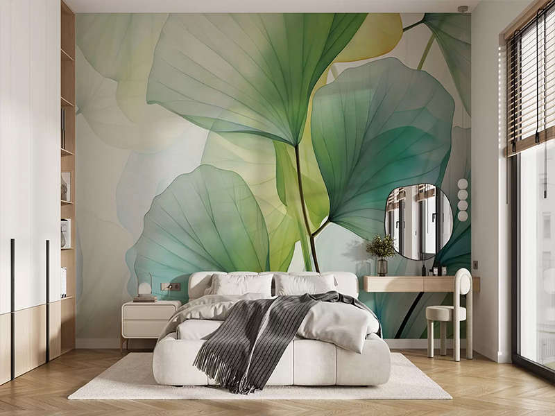 Ova osvežavajuća 3D fototapeta donosi krupni prikaz transparentnih listova u nijansama zelene, plave i žute, stvarajući osećaj lakoće i prozračnosti u prostoru. Savršeno se uklapa u moderne spavaće sobe i enterijere koji teže prirodnom balansu i mekoj estetici. Dekoracija koja umiruje, osvežava i unosi prirodu u svakodnevicu.